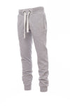 Pantalone da uomo in felpa, rib elasticizzato in vita e a fondo gamba, zip con patta, coulisse bianca in corda con cuciture in contrasto e anelle in metallo, due tasche frontali con rib e un taschino dietro, patta con zip e cuciture rinforzate.