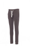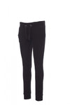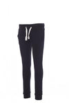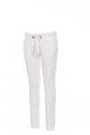 Pantalone da donna in felpa, rib elasticizzato in vita e a fondo gamba, coulisse bianca in corda con cuciture in contrasto e anelle in metallo, due tasche frontali con rib e cuciture rinforzate.