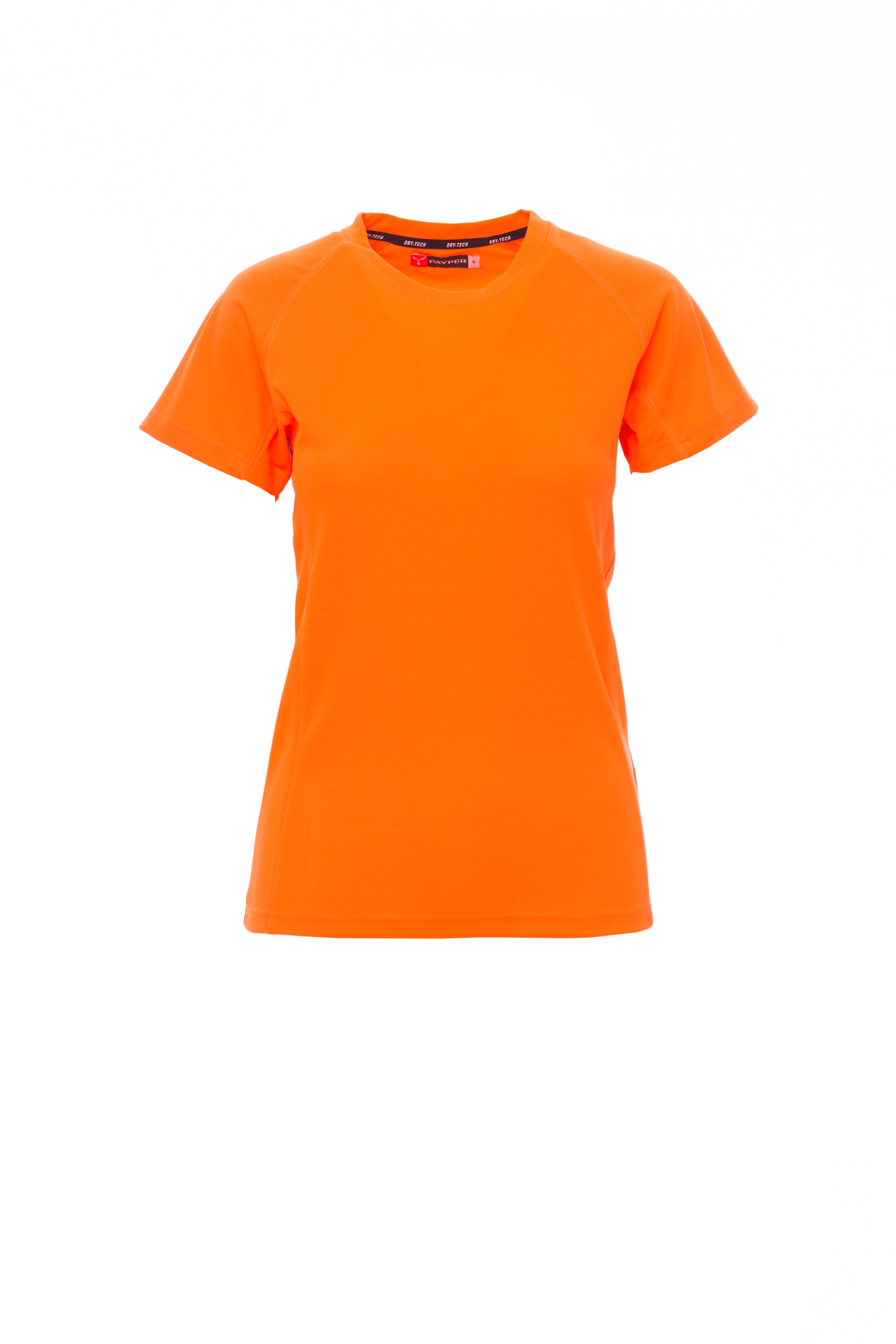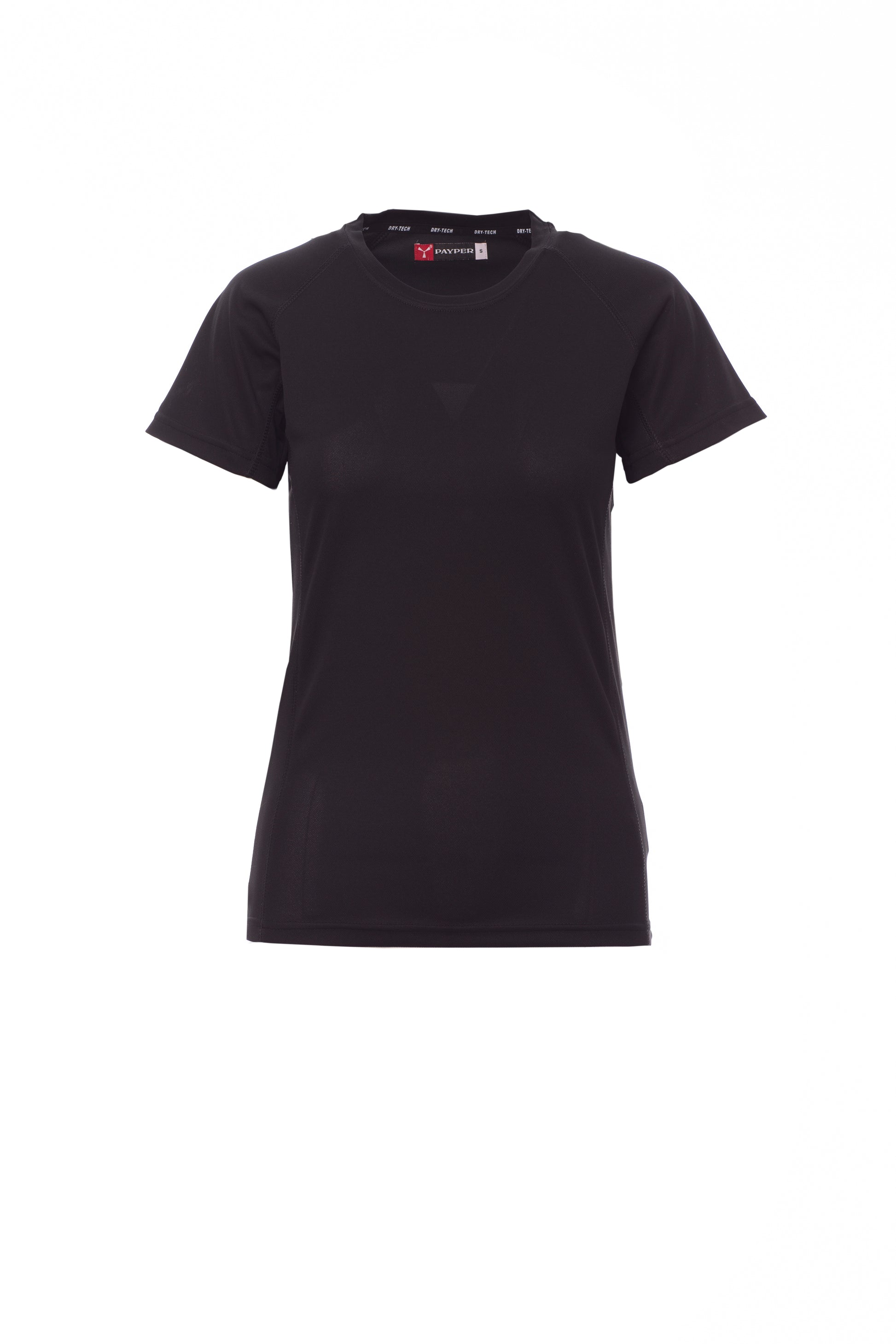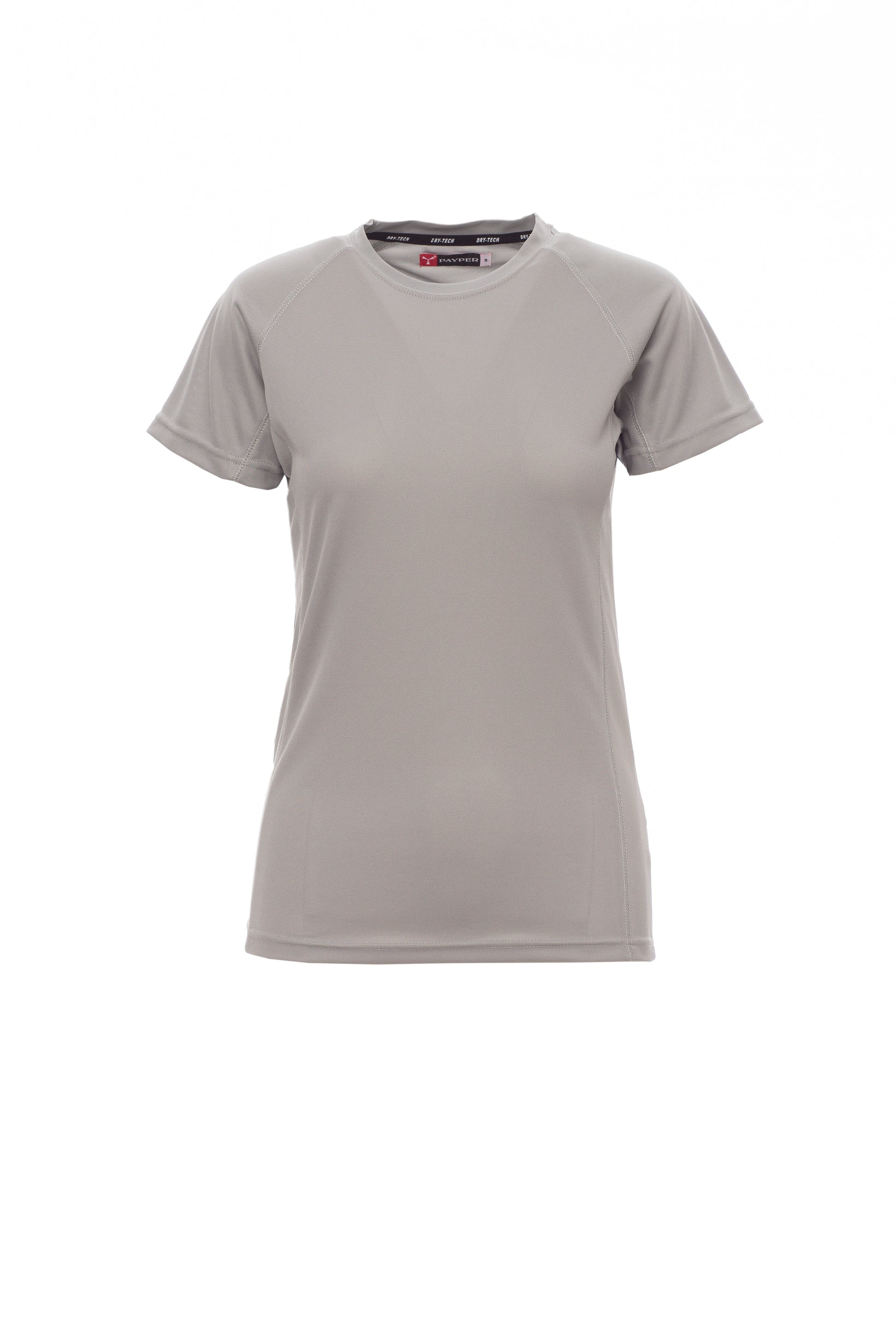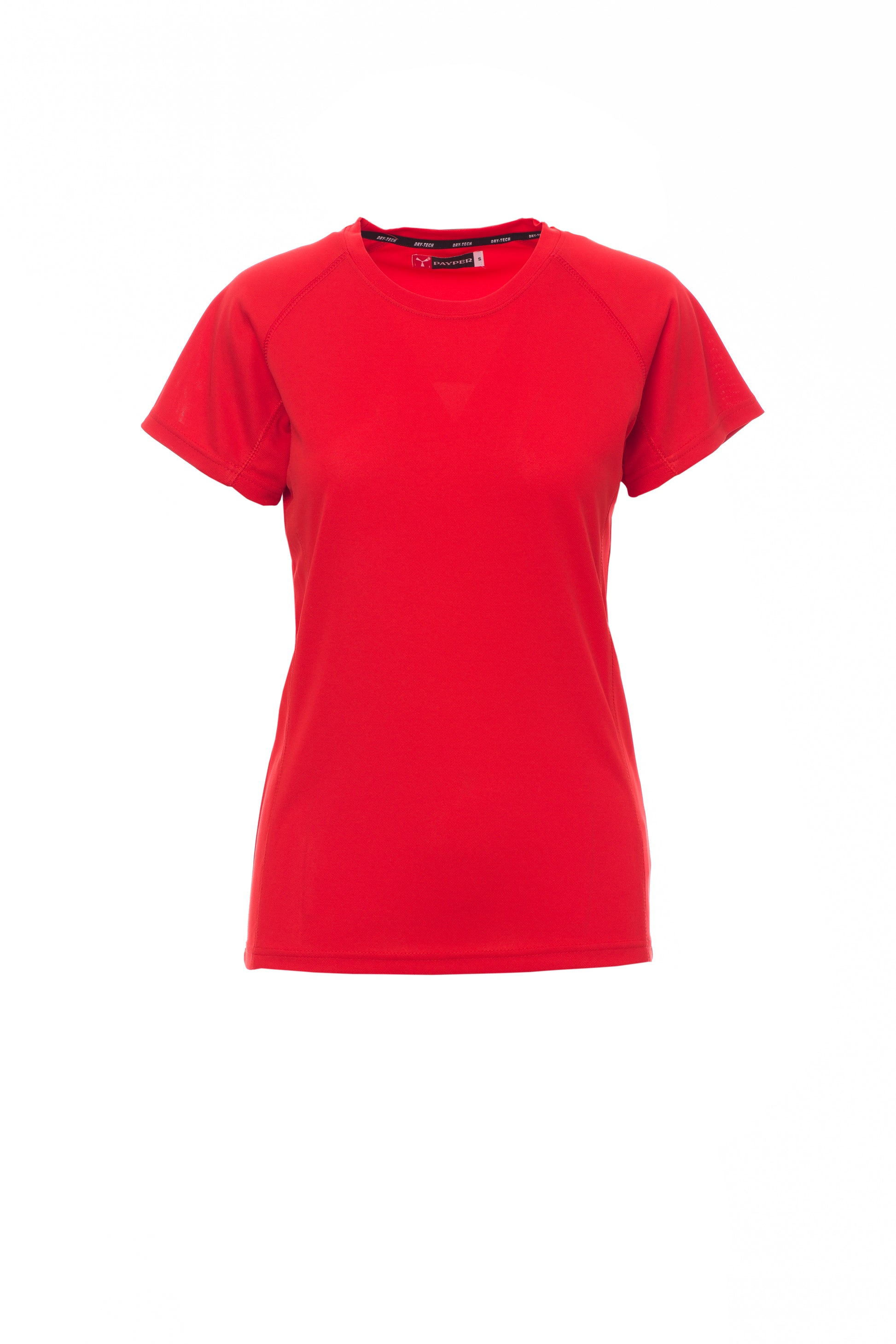 T-shirt tecnica-sportiva sfiancata da donna con manica raglan, doppia cucitura laterale per una migliore vestibilità, nastratura al collo.