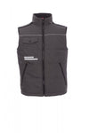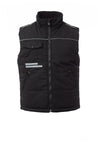 Gilet unisex, zip 8mm in plastica con cursore in metallo, retro sagomato, due ampie tasche esterne con zip, ampia tasca al petto multifunzione, porta smartphone e bande riflettenti, anello porta badge. Interno: imbottitura trapuntata e rifinita con fodera ad alta densità, interno colletto in pile, una tasca.
