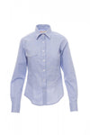 Camicia donna , vestibilità sfiancata, pinces di ripresa davanti e dietro, colletto modello italiano, davanti con cannoncino cucito a vista e bottoni bianche effetto perlato; polso sagomato a due bottoni e un asola, dietro con carrè. Una tasca tecnica al petto chiusa da patta con bottone e due asole porta penna.