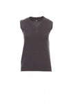 Gilet da donna con scollo a V, lavorazione a punto rasato fine, confezione a maglia calata senza cuciture, costine fini per il bordino collo, i giromanica e i bordi inferiori.