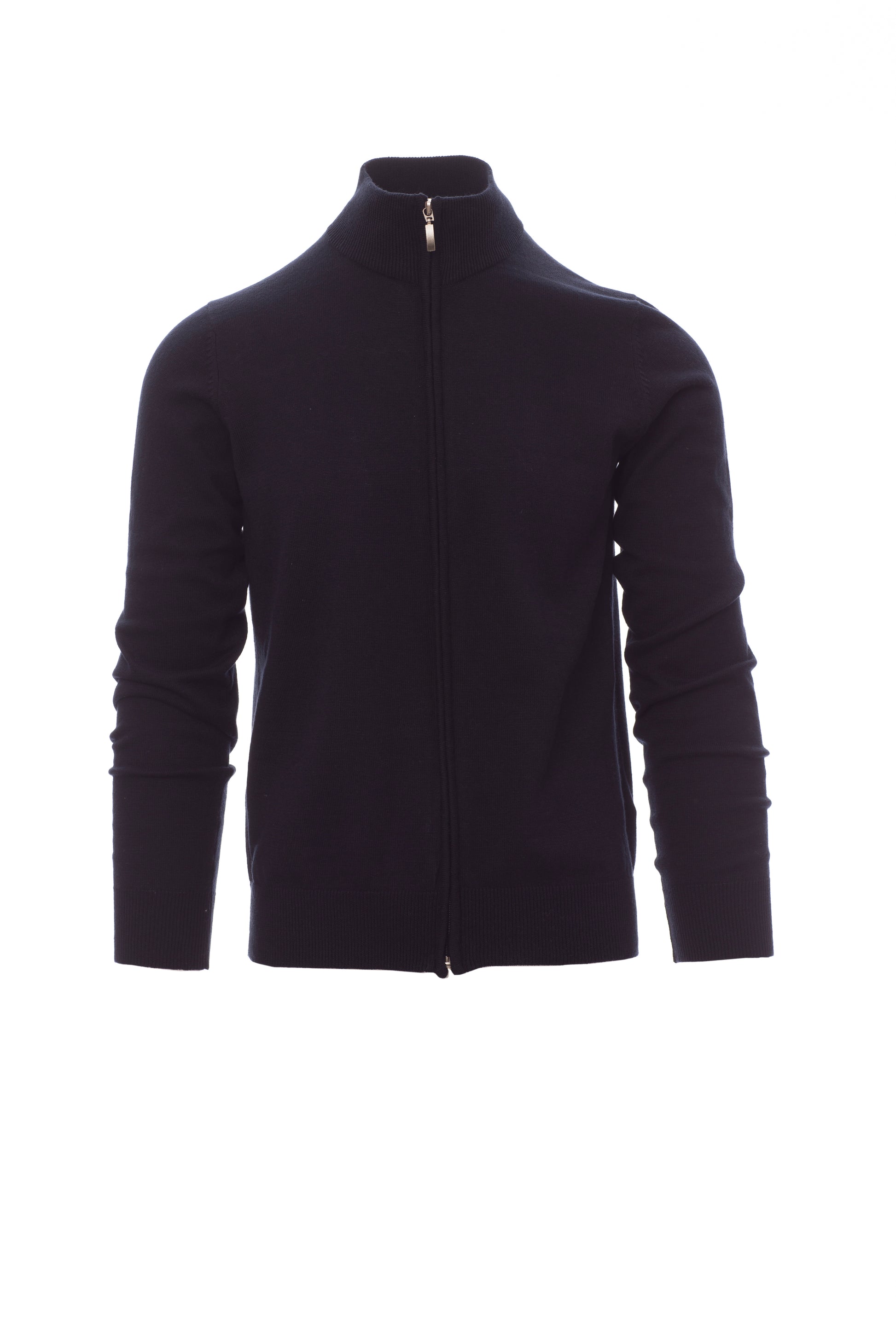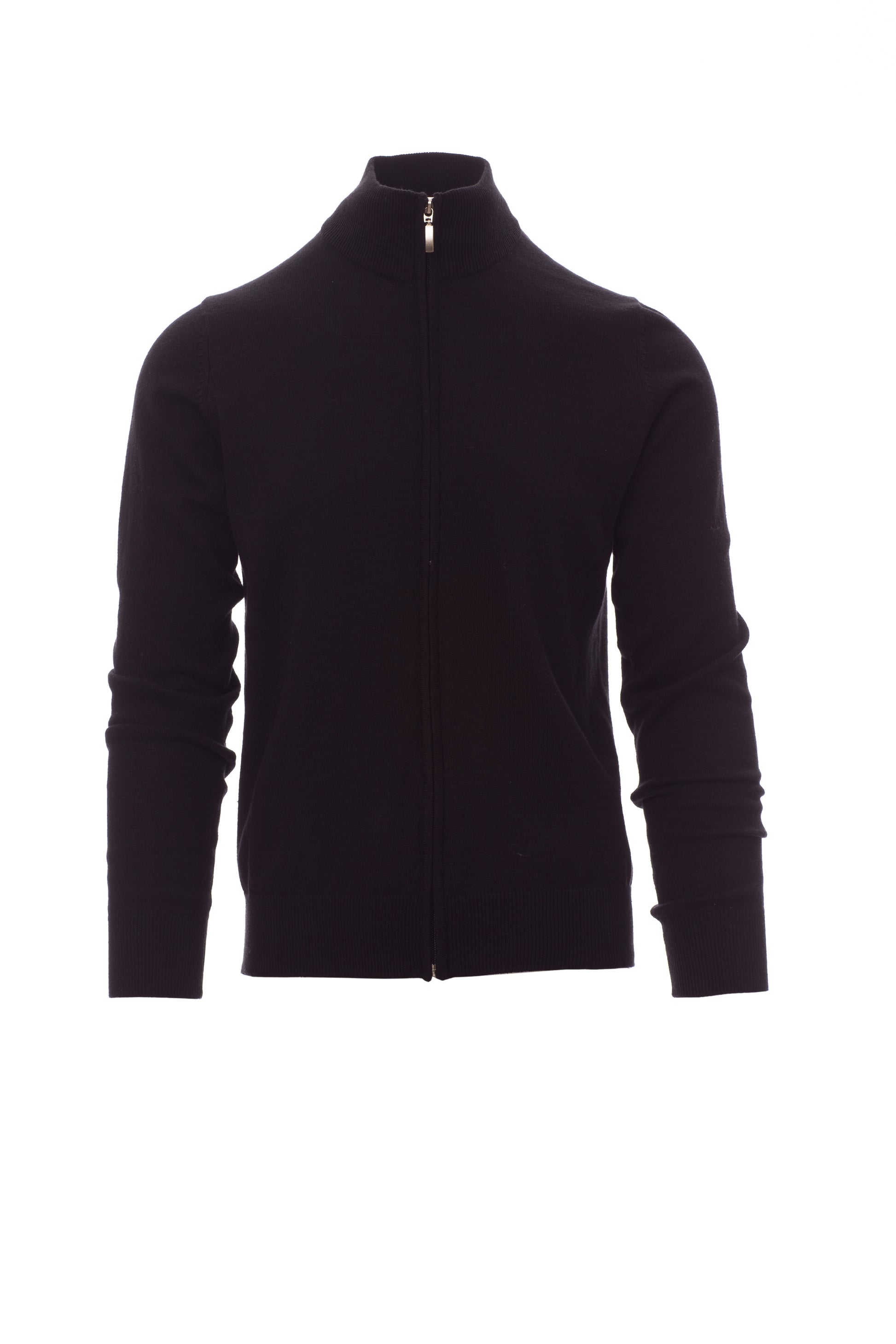 Maglioncino unisex a zip intera, lavorazione a punto rasato fine, confezione a maglia calata senza cuciture,  costine fini per il collo, per i polsi e i bordi inferiori, con toppe ai gomiti.