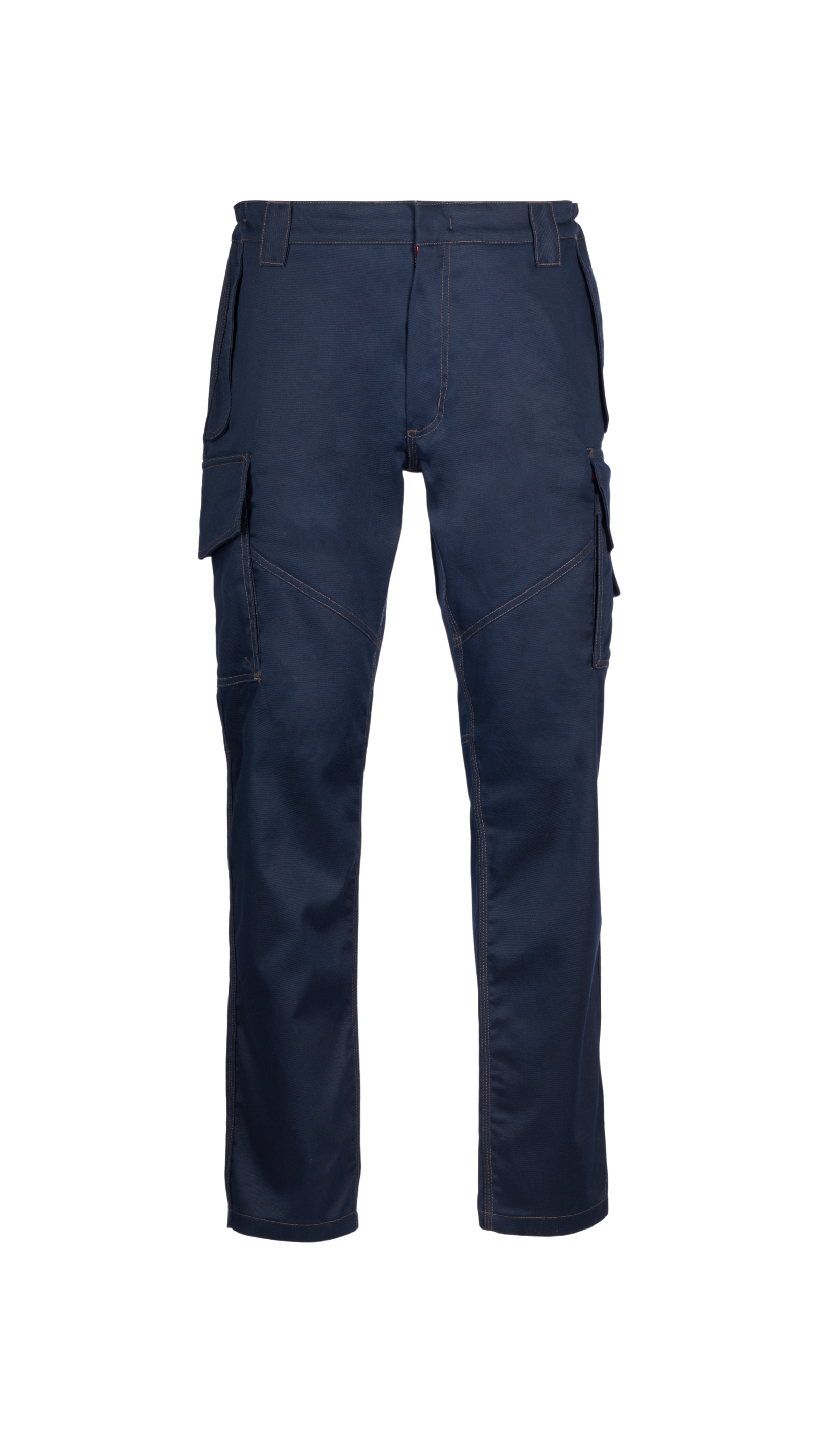 Pantaloni in tessuto antistatico, antifiamma, con proprietà resistenti all’arco elettrico e agli agenti chimici, ideale per saldatori. Cuciture in contrasto doppie e triple in filato ignifugo. Cintura sagomata più alta dietro, per una migliore copertura, con elastici laterali e passanti in vita. Chiusura con zip metallica bicolore coperta da patta e bottone a pressione. Tasche anteriori con patta e chiusura a strappo. Tasconi laterali a soffietto, di cui una con patta sagomata con chiusura a strappo, zip metallica bicolore interna, etichetta riepilogativa delle certificazioni. Due tasche posteriori con patta e chiusura a strappo, di cui una con bande retroriflettenti. Tutti gli accessori visibili resistono alle fiamme. Nessun accessorio metallico è a diretto contatto con la pelle dell'utilizzatore.