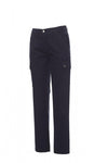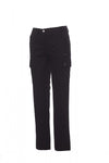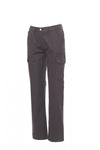 Pantalone donna, taglio classico, multistagione, elastici laterali e passanti in vita, chiusura con zip e bottone in metallo, due tasche anteriori a taglio classico, due tasche laterali con patta e bottoni automatici, una tasca con zip lato sinistro, un porta metro a scomparsa lato destro, due tasche posteriori a filo con asola e bottone.