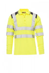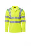 Polo bicolore da uomo a manica lunga in alta visibilità con bande riflettenti, con 3 bottoni in tinta effetto perlato, collo e bordo manica con fine profilo a contrasto, colletto e bordo manica a costine, spacchetti laterali, cuciture del collo coperte.