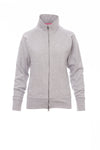 Felpa da donna, zip intera SBS coperta, in plastica con doppio cursore in metallo, manica raglan, due tasche con zip coperte, polsini e vita in costina elasticizzata, cuciture rinforzate.