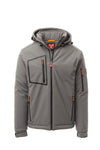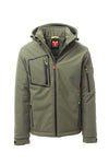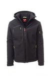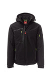 WP 8000 mm H₂O, WVT 5000 g/m² 24h. Soft-shell imbottito da uomo, chiusura tramite zip SBS con cursore in metallo "semi-auto lock" e tiretto personalizzato. Cappuccio removibile, con coulisse regolabile. Colletto interno con dettagli laterali in pile. Bande retroriflettente su spalle, fondoschiena e retro cappuccio. Polsini elasticizzati, regolabili con velcro e manicotto interno. Tasca termosaldata sul petto, chiusa con zip spalmata. Due tasche laterali, chiuse con zip dal dettaglio retroriflettente. Tasca sul braccio sinistro con porta penne integrato, chiusa con zip. Tiretti fluorescenti. Due tasche interne, una sagomata con zip sul petto destro e una porta tablet chiusa con velcro. Fondo regolabile con stopper personalizzati.