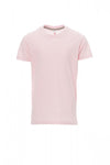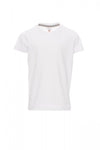 T-shirt da bimbo girocollo manica corta, colletto in costina misto spandex da 1.5 cm con cucitura ribattuta sul davanti, nastro di rinforzo da spalla a spalla in colore a contrasto visibile nel colletto, cuciture stretch, cucita lateralmente