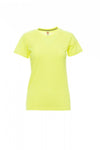 T-shirt girocollo manica corta sfiancata da donna, colletto in costina misto spandex da 1,5cm con cucitura ribattuta sul davanti, nastro di rinforzo da spalla a spalla in colore a contrasto visibile nel colletto, cuciture stretch, cucitura laterale